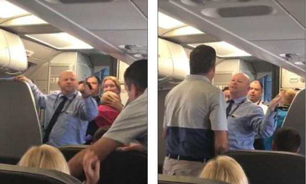 وبعد دقائق صعد موظف آخر من الشركة، قالت سكوت إنه مضيف إلى الطائرة وواجه الراكب، وبعد ذلك حدثت مواجهة بين الإثنين في ممر الطائرة وتسنى سماع المضيف وهو يهدد الراكب بالضرب، وفي نهاية الأمر عاد الراكب إلى مقعده ونزل المضيف من الطائرة.