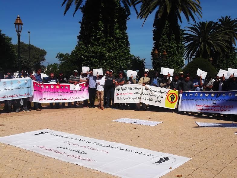وقد حضر الوقفة الاحتجاجية ممثلين عن المكاتب الوطنية للنقابات التعليمية الأكثر تمثيلية  والذين أكدوا مجتمعين، من خلال كلمتهم في ذات السياق، على أحقية المطلب باعتباره مكتسبا تاريخيا، واستنكروا تجاهل الوزارة للمطالب العادلة والمشروعة للموظفين حاملي الشهادات العليا، وشددوا على الاستمرار في الأشكال النضالية المشروعة حتى تحقيق المطلب لهذا الفوج وإدراج الترقية بالشهادات في النظام الأساسي لموظفي وزارة التربية الوطنية والتكوين المهني لتستفيد منه الأفواج القادمة.