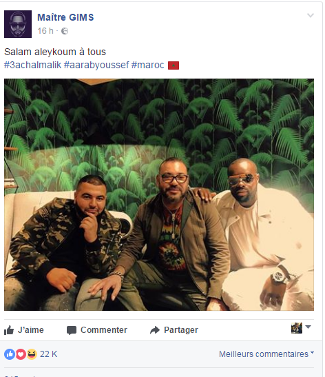 نشر مغني الراب الفرنسي من أصل كونغولي "ميتر جيمس"، صورة على صفحته بموقع "فيسبوك" تجمعه بالملك محمد السادس، الذي يقضي حالياً عطلة خاصة بالعاصمة الفرنسية باريس.