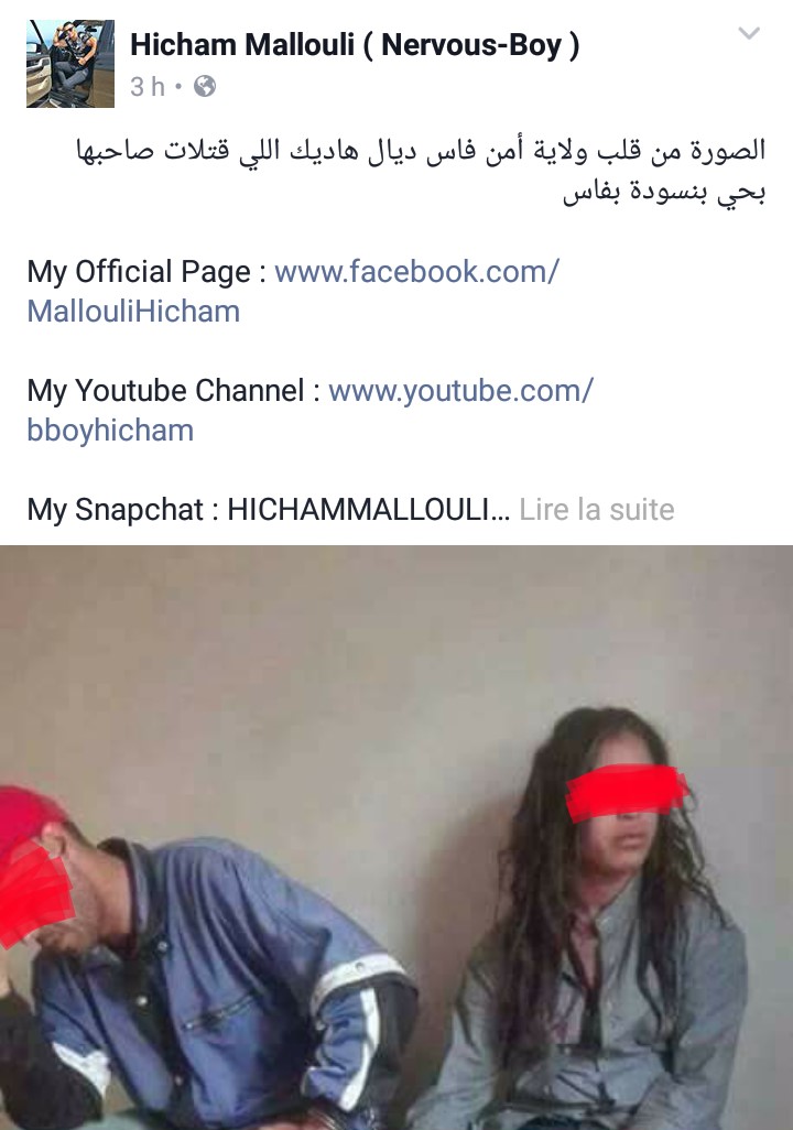 نشر الشرطي الشهير هشام الملولي صورة على حائطه الفيسبوكي الشخصي ، يقول أنها تعود لفتاة يشتبه في قتلها لصديقها ، حيث ظهرت الفتاة مصفدة رفقة شاب ، وبوجه مكشوف .