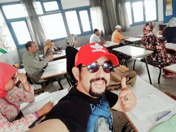 و ظهر البخاري في الصورة المنشورة على حسابه بالفايسبوك ، داخل قاعة الامتحان، معلقا عليها بتدوينة قال فيها " يا بسم الله " .
