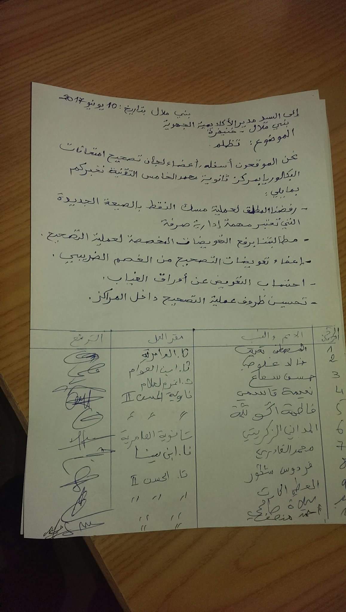 وارتباطا بنفس الموضوع وبثانوية محمد الخامس التقنية اتخذ الأساتذة المكلفون بتصحيح مواضيع البكالوريا،قرار عدم مسك نقط التصحيح بالصيغة الجديدة ، ووجهوا تظلما على شكل شكاية لمدير الاكاديمية الجهوية للتربية والتكوين بني ملال خنيفرة يتضمن مجموعة من المطالب ،كرفع التعويضات واعفاء تعويضات التصحيح من الخصم الضريبي وتحسين ظروف التصحيح داخل المراكز .