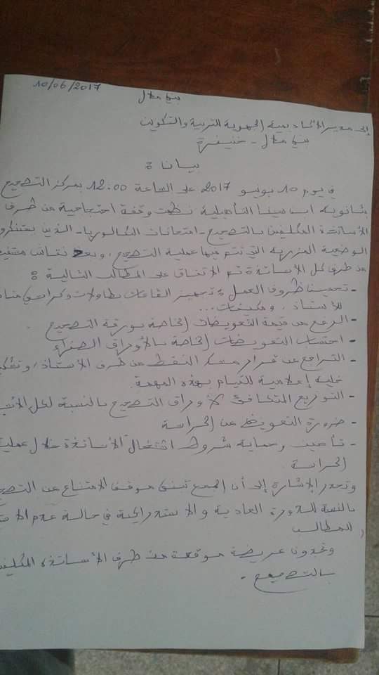 نظم مجموعة من الاساتذة المكلفين بتصحيح امتحانات الباكالوريا بمركز التصحيح بثانوية ابن سينا التأهيلية ببني ملال ، وقفة احتجاجية اليوم السبت 10 /06/ 2017 ، وذلك من أجل كشف الوضعية المزرية التي يصححون فيها الامتحانات ، وطالبوا بتحسين ظروف العمل و الرفع من تعويضات التصحيح و تأمين وحماية شروط اشتغال الاساتذة خلال عملية الحراسة.
