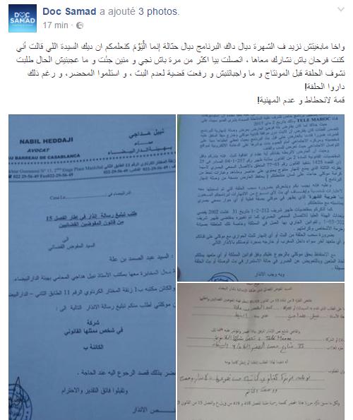 وشدد "دوك صمد" على أنه “اتصلت بيا اكثر من مرة باش نجي و منين جئت و ما عجبنيش الحال طلبت نشوف الحلقة قبل المونتاج و ما واجوباتنيش و رفعت قضية لعدم البث ، و استلموا المحضر، و رغم ذلك داروا الحلقة!..”