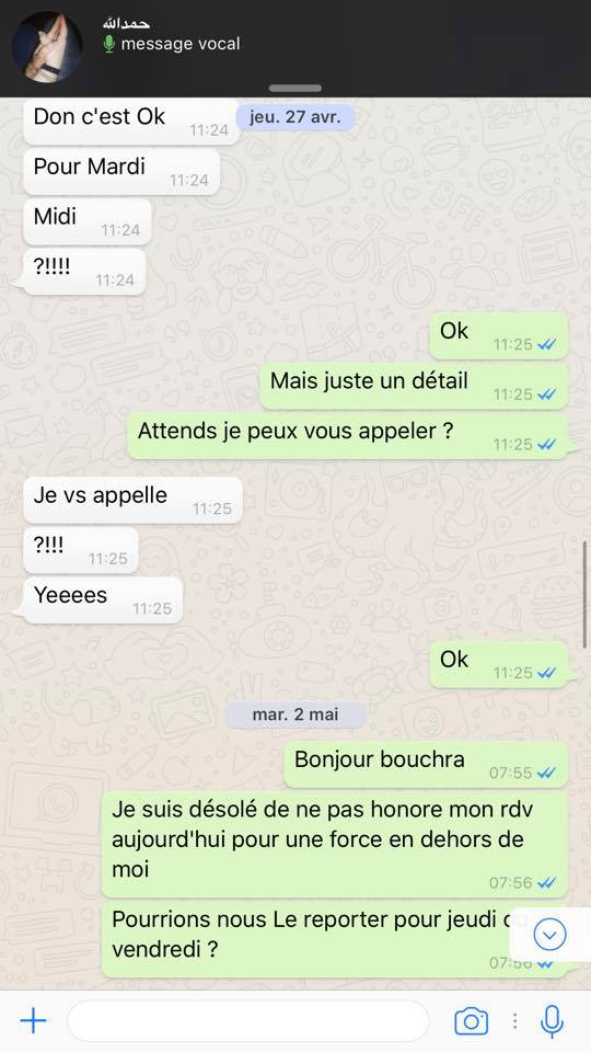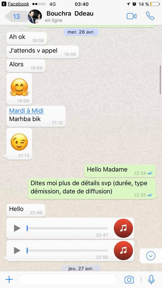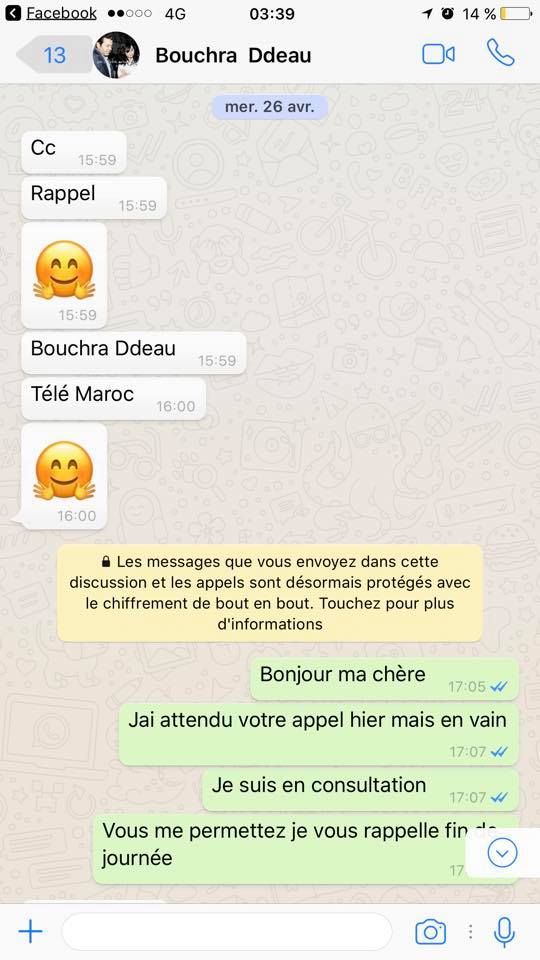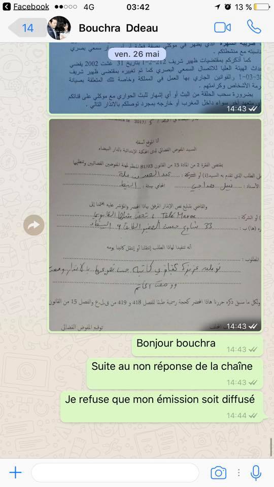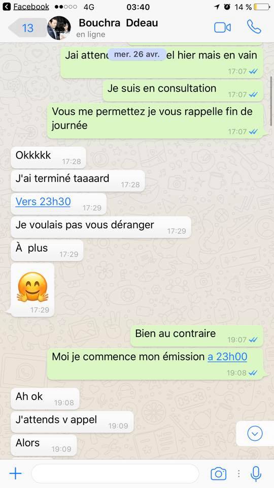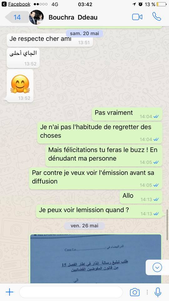 و أردف قائلا " كل هذا موثق بالصور اللي غادي تشوفوا وmessages vocaux اللي بعثاتلي قبل الحلقة، وتؤكد أنها big fan ديالي! إذن، واش أنا اللي رغبتها ندوز؟ أين العقل والصح؟"، مضيفا في ختام تدوينته " اتقي الله من الكذب الافتراء.. هذه ليست من قيمة الإعلامي ولا من قيمة الإنسان المتوازن عقليا. وسيكون آخر كلامي وردي على موضوع إنسانة كذابة وظالمة في حقي.. حسبي الله ونعم الوكيل".