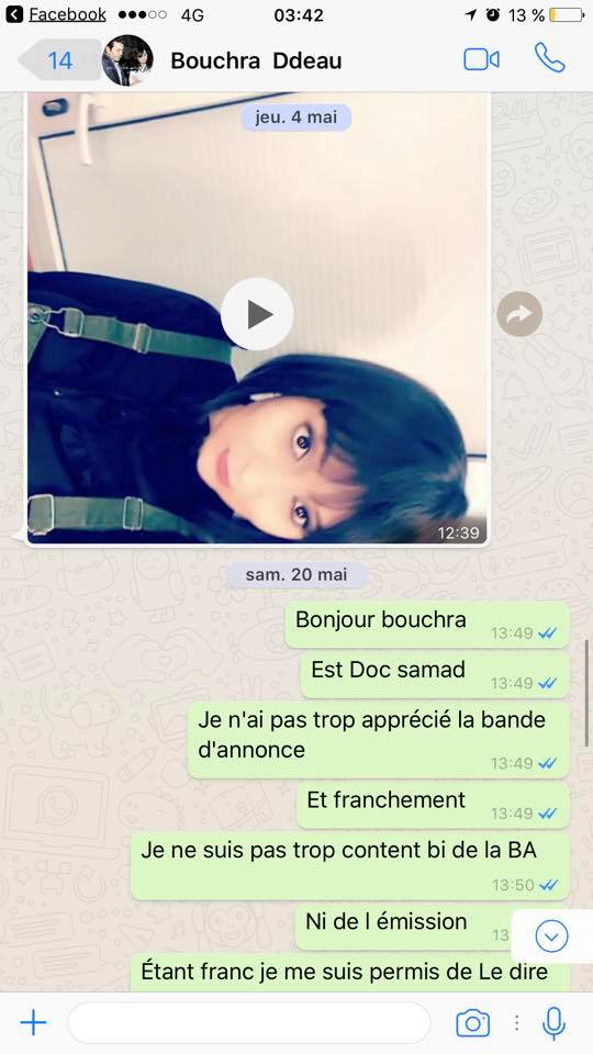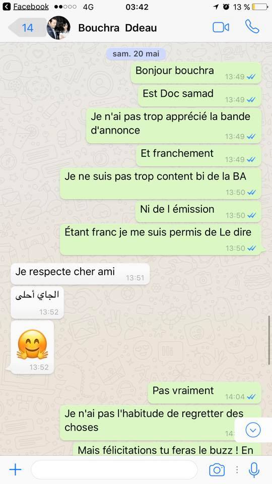 و نشر الطبيب المثير للجدل على صفحته الفايسبوكية ، صورا لمحادثاته مع بشرى الضو عبر الواتسآب حيث قامت الاخيرة بتوضيح فكرة البرنامج و ابداء إعجابها الكبير بالضيف كما استعرضت صور "النيو لوك" الذي ظهرت به في برنامج " ضريبة الشهرة " ، و قال "Doc Samad" في تدوينة مرفقة " بغيت نغلق موضوع التي تسمى مقدمة برامج وناقلة الخبر الكاذب، ليس من شيمي المعيور، إنما لي حق الرد على إنسانة سبتني وقذفتني، وأكثر من ذلك قالت إنني رغبتها باش ندوز معاها (هي اللي طلباتني)، وكنت فرحان من حوارها (أبدا وطلبت أن أرى حلقتي)، ندوز معاها فراديوها (أنا عندي برنامجي ناجح فراديو آخر، لا أحتاج إلى راديوها)، دفعت cv باش نخدم ف télé maroc وهي ما بغاتش (télé maroc est représentée par son directeur général M.nini. Pas elle et c’est lui le porte parole pas elle)".