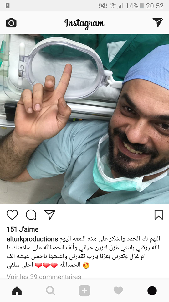 و قال  في تعليق " اللهم لك الحمد والشكر على هذه النعمة اليوم الله رزقني بابنتي غزل لتزين حياتي والف حمد الله على السلامة يا ام غزل وتتربى في عزنا ..يارب تقدرني وأعيشها أحلى عيشة الحمد لله".