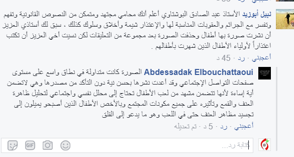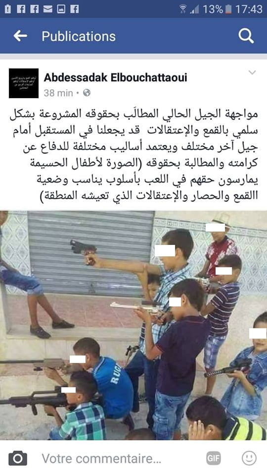 قام المحامي عبد الصادق البوشتاوي، عضو هيئة الدفاع عن معتقلي "حراك الريف" بنشر تدوينة تتضمن صورة مفبركة لأطفال يلهون ببنادق بلاستيكية  على حائطه بالفايسبوك معلقا على الصوره بأنها "لأطفال من الحسيمة يمارسون حقهم في اللعب بأسلوب يناسب وضعية القمع والحصار والاعتقالات الذي تعيشه المنطقة". هذه التدوينة  جرت عليه غضب متابعي صفحته الذين رأوا فيها تحريضا مبطنا على العنف الشيء ليضطر بعد ذلك إلى حذف كامل التدوينة .