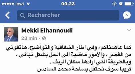 و أوضح الحنودي ، المنتمي لحزب الاتحاد الاشتراكي، مساء أمس السبت في تدوينة على الفايسبوك " كما عاهدناكم ، وفي إطار الشفافية والتواضح، هاتفوني من القصر، والأمور ماضية إلى الحل بشكل نهائي ، وبالطريقة التي أرادها سكان الريف" ، مضيفا " قريبا سوف نحتفل بساحة محمد السادس".