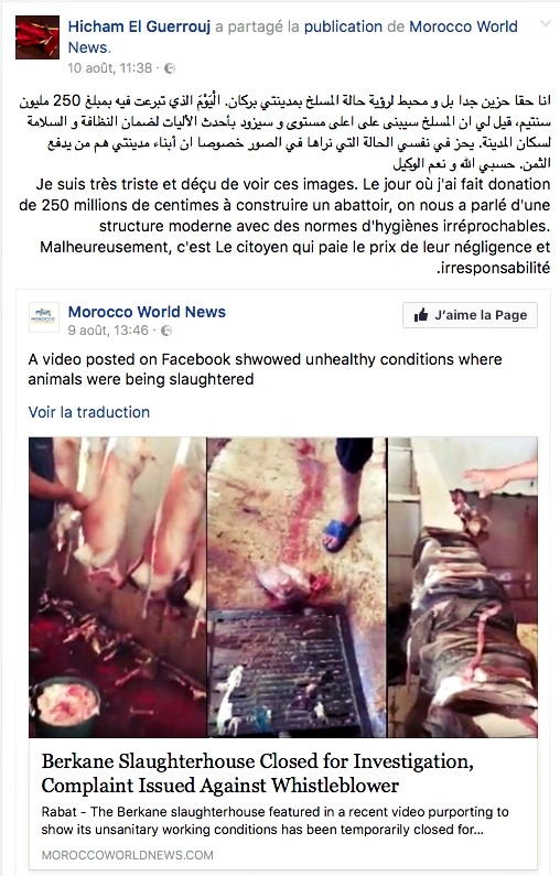 بعد الضجة الكبرى التي خلفها " الفيديو " الفضائحي الذي تقمصت خلاله الفنانة الشعبية نجاة عتابو ، دور الساسة ، بكشفها خروقات و تجاوزات تعيش على وقعها مدينة الخميسات، مسقط رأسها، اقتفى البطل العالمي في أم الرياضات ، العداء السابق هشام الكروج، خطى " الديفا " ليكشف بدوره عن فضيحة أخرى شهدتها مدينة بركان ، حيث نشر تدوينة نارية عبر صفحته الخاصة عبر الفيسبوك ، قال فيها : " أنا حقا حزين جدا بل و محبط لرؤية حالة المسلخ " المجرزة " بمدينتي بركان "، وأردف الكروج قائلا : " الْيَوْمَ الذي تبرعت فيه بمبلغ 250 مليون سنتيم، قيل لي ان المسلخ سيبنى على اعلى مستوى و سيزود بأحدث الآليات لضمان النظافة والسلامة لسكان المدينة "، قبل أن يضيف : " يحز في نفسي الحالة التي نراها في الصور خصوصا أن أبناء مدينتي هم من يدفع الثمن … حسبي الله و نعم الوكيل ".