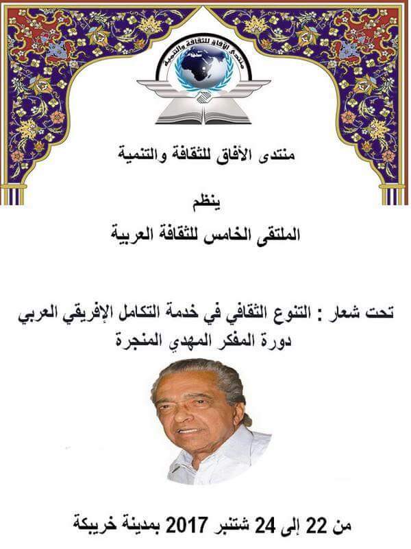تحت شعار " التنوع الثقافي في خدمة التكامل الإفريقي العربي، تحتضن مدينة خريبكة الملتقى الخامس للثقافة العربية، دورة المفكر المهدي المنجرة، أيام 22، 23 و 24 شتنبر المقبل.