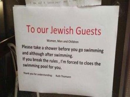 وكتب على إحدى اللافتات "إلى ضيوفنا اليهود من الرجال والنساء والأطفال، الرجاء الاستحمام قبل السباحة"، و"في حال خالفتم الإرشادات سنكون مضطرين إلى منعكم من استخدام بركة السباحة".