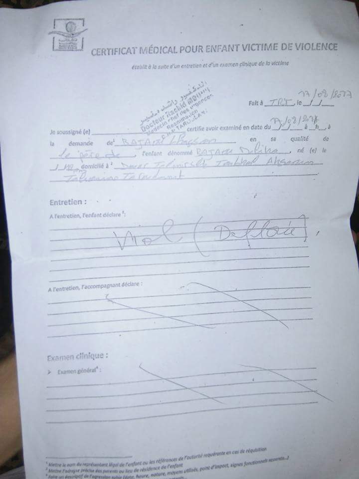وأضاف الأب المكلوم :"  صدمت لما تعرضت له ابنتي "مليكة" ولم يكن لي إلا أن توجهت إلى مكان تجمع أهل الدوار أمام أحد المساجد وأخبرتهم بالواقعة وبعدها توجهت لمدينة تارودانت لعرضها على الطبيب حيث تأكد بالفعل أنها تعرضت للإغتصاب".