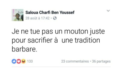 وقالت الاستاذة الجامعية في تدوينة نشرتها على حسابها الرسمي بموقع التواصل الاجتماعي فيسبوك ان ذبح الخروف في عيد الاضحى امام اعين الاطفال لمجرد التضحية هو تقليد همجي و ذلك في اشارة لعيد الاضحى.
