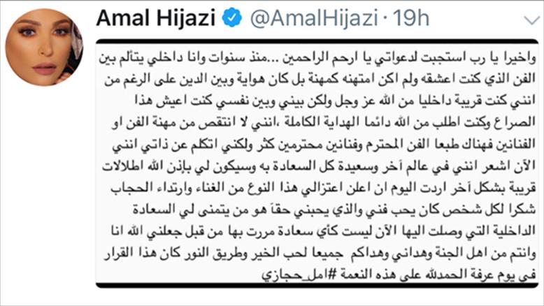 أعلنت الفنانة اللبنانية المشهورة أمل حجازي اعتزال الفن وارتداء الحجاب، وجاء الإعلان بعيد شائعات ترددت على نطاق واسع حول اعتزالها الفن، وتداول نشطاء وسائل التواصل الاجتماعي صورا لها مرتدية الحجاب.