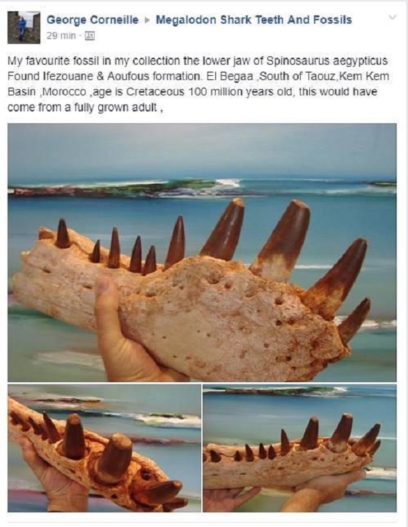 ونشر تاجر تحف إيرلندي يدعى جورج كورنيل إعلاناً على فيس بوك يعرض بيع أجزاء من الديناصور النادر ومنشأه المغرب، حيث عبر عن استعداده لبيع قطع من الهيكل، والتي يصل عمرها إلى 100 مليون سنة، مرفقاً إعلانه على الصفحة لبيع الحفريات على فيس بوك بصور لقطعة صغيرة من فك الديناصور الذي عثر عليه بالمغرب.