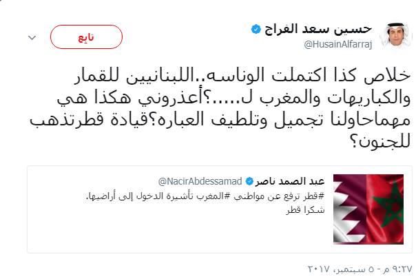 بعد إقرار السلطات القطرية إعفاء المغاربة من تأشيرة دخول أراضيها، توالت ردود الأفعال بين مؤيد للقرار و رافض له ، حيث طرح الإعلامي السعودي حسين سعد الفراج ، تغريدة مستفزة جدا، أثارت جدلا كبيرا بين رواد " التويتر " ، حيث قال : " خلاص كذا اكتملت الوناسه … اللبنانيين للقمار و الكباريهات و المغرب لـ … ؟ اعذروني هكذا هي مهما حاولنا تجميل و تلطيف العبارة ؟ قيادة قطر تذهب للجنون ".