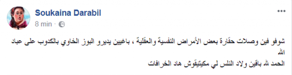 وكتبت درابيل في تدوينة فايسبوكية "شوفو فين وصلات حقارة بعض الأمراض النفسية والعقلية ، باغيين يديرو البوز الخاوي بالكدوب على عباد الله .. الحمد لله باقين ولاد الناس لي مكيتيقوش هاد الخرافات".