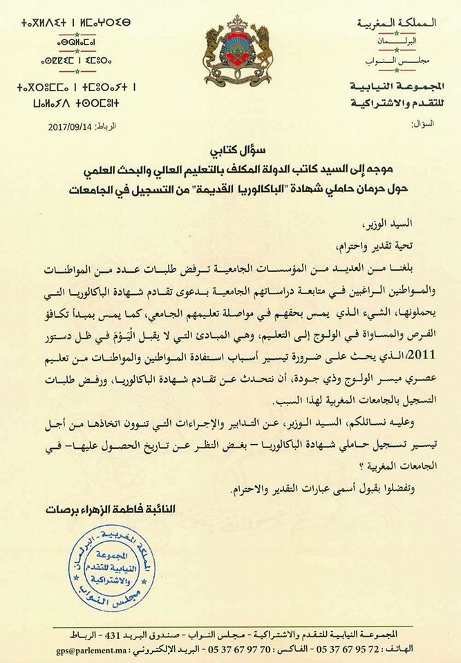 وجهت النائبة البرلمانية السيدة فاطمة الزهراء برصات، عن المجموعة النيابية للتقدم والاشتراكية، سؤالا كتابيا إلى السيد كاتب الدولة المكلف بالتعليم العالي و البحث العلمي، حول حرمان حاملي شهادة البكالوريا القديمة من التسجيل في الجامعات ، حيث أكدت النائبة البرلمانية أنها تلقت بأسف شديد خبر منع جامعات مغربية ، حاملي هذه الشواهد من التسجيل من أجل مواصلة دراستهم الجامعية ، بدعوى تقادمها ، و هو الأمر الذي يمس بمبدأ تكافؤ الفرص والمساواة في الولوج إلى التعليم تضيف برصات.