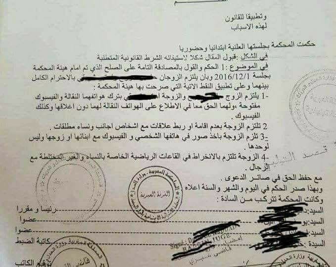 و حسب الحكم الصادر بتاريخ دجنبر 2016، فقد ألزمت المحكمة الزوجين بعد عقد صلح أمام أنظارها بترك حسابيهما بموقع التواصل الاجتماعي (الفيسبوك ) مفتوحين مع حرية اطلاع كل واحد منهما على هاتف وحساب الأخر دون اغلاقه ، فضلا عن التزام الزوجة بعدم اقامة علاقات مع أشخاص أجانب أو نساء مطلقات، والتقاط صور في هاتفها الشخصي و الفيسبوك مع أبنائها أو زوجها و ليس بمفردها.