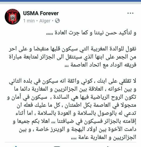 وفي تدوينة مثيرة قالت جماهير الفريق الجزائري : " ولتأكيد حسن نيتنا و كما جرت العادة، نقول للوالدة المغربية التي سيكون قلبها منقبضا و على احر من الجمر على ابنها الذي سينتقل إلى الجزائر لمتابعة مباراة فريقه الوداد مع اتحاد العاصمة ، لا تقلقي على ابنك ، كوني واثقة انه سيكون في بلده الثاني وبين إخوانه ، العلاقة بين الجزائريين و المغاربة دائما ما تكون الروح الرياضية فيها هي السائدة ، سيكون في أمان و متجولا في العاصمة بكل اطمئنان ، كل ما عليك فعله أن تدعي له بالوصول بالسلامة والعودة بالسلامة ، أما أثناء إقامته بالجزائر فسيكون في ضيافتنا ، اهلا بكم جميعا ودامت الأخوة بين أولاد البهجة و الوينرز خاصة ، و بين الجزائريين و المغاربة عامة.