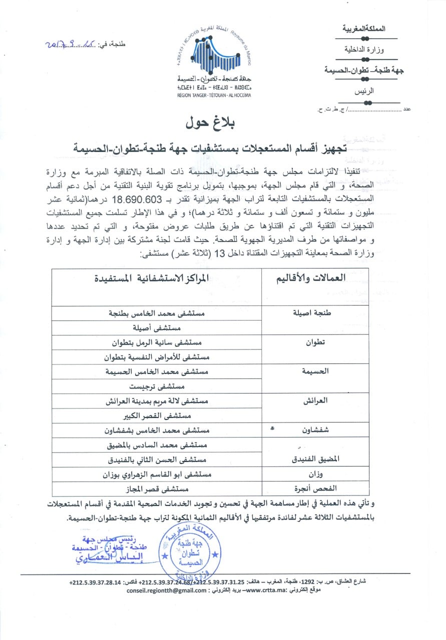 في بلاغ له، أكد السيد إلياس العماري ، رئيس جهة الشمال، أن جميع مستشفيات جهة طنجة تطوان الحسيمة تسلمت قبل أيام ، التجهيزات التقنية التي تم اقتناؤها عن طريق طلبات عروض مفتوحة، والتي تم تحديد عددها و مواصفاتها من طرف المديرية الجهوية للصحة. حيث قامت لجنة مشتركة بين إدارة الجهة وإدارة وزارة الصحة بمعاينة التجهيزات المقتناة داخل 13 مستشفى.