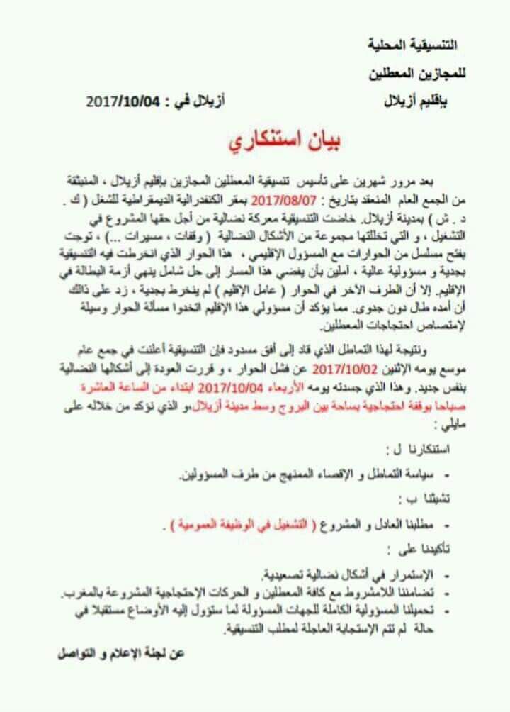 عاد المعطلون أصحاب الشواهد للاحتجاج من جديد بشوارع أزيلال ، وذلك بسبب ما اسموه فشل الحوار مع السلطات الاقليمية على رأسها عامل الاقليم محمد العطفاوي ، وسن السلطات لسياسة التسويف والمماطلة والاقصاء الممنهج ، واتخادها من الحوار وسيلة لربح الوقت وامتصاص الاحتجاج ، على حد تعبير المحتجين .