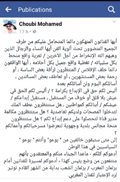 وختم تدوينته:" أدعوكم كلكم - ماعدا الجبناء منكم والمعتقدون بأنهم منتفعون من وضع بئيس كهذا - أدعوكم لمسيرة للفنانين أمام برلمان المغرب / برلمان الشعب بداية من الشهر القادم نونبر لرد الإعتبار للفنان المغربي".