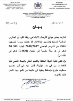 نفت كتابة الدولة المكلفة بالتعليم العالي والبحث العلمي وتكوين الأطر في بيانا تتوفر"أخبارنا" على نسخة منه أن ما ورد في وثقية تفيد أن المدارس الوطنية للتجارة التسيير (ENCG) أنها لم تحدد رسوم التسجيل انطلاقا من الموسم الجامعي 2017/2018 قيمتها 200.000 درهم في كل سنة مقسمة إلى دفعتين (10.000 درهم في الأسدس).
