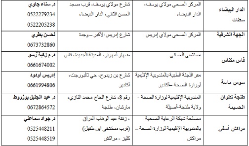 فيما يلي لائحة أسماء وعناوين المؤسسات الصحية المعنية بخدمات التغطية الصحية لمشجعي الفريق الوطني: