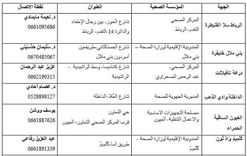 1- سيتم تقديم خدمات التلقيح ضد داء الحمى الصفراء والتهاب السحايا وكذا العلاج الوقائي لداء الملاريا بالمؤسسات الصحية المحددة في الجدول أسفله الذي يحددأسماء وعناوينوكذا نقطة الاتصالبهذه المؤسسات.