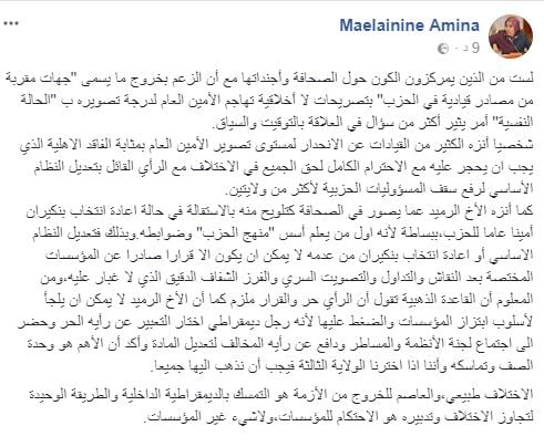 وختمت تدوينتها بالقول " الاختلاف طبيعي،والعاصم للخروج من الأزمة هو التمسك بالديمقراطية الداخلية والطريقة الوحيدة لتجاوز الاختلاف وتدبيره هو الاحتكام للمؤسسات،ولاشيء غير المؤسسات".