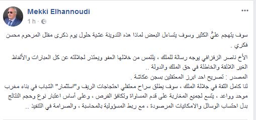 و تابع بالقول "الأخ ناصر الزفزافي يوجه رسالة للملك ، يلتمس من خلالها العفو ويعتذر لجلالته عن كل العبارات والألفاظ الغير اللائقة والخاطئة في حق الملك والدولة .. المصدر : تصريح احد ابرز المعتقلين بسجن عكاشة ".