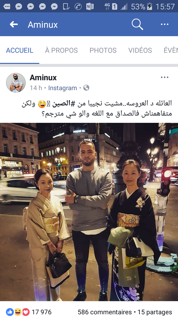 في خطوة طريفة نشر الفنان المغربي "أمين التامري" الملقب بأمينوكس صورة على حسابه الشخصي "الفيسبوك"،جمعته مع فتاتين من الصين،وارفقها بعبارة ساخرة يؤكد فيها أنه قام بالذهاب للصين للبحث عن عروسة،إلا أنه إصطدم بالإختلاف الكبير المتواجد بين البلدين على مستوى اللغة والثقافة.