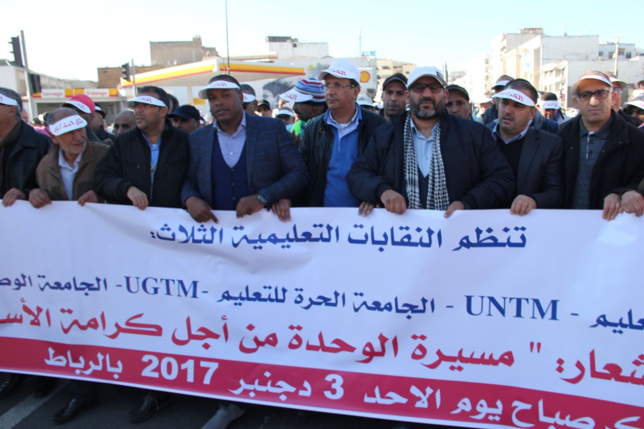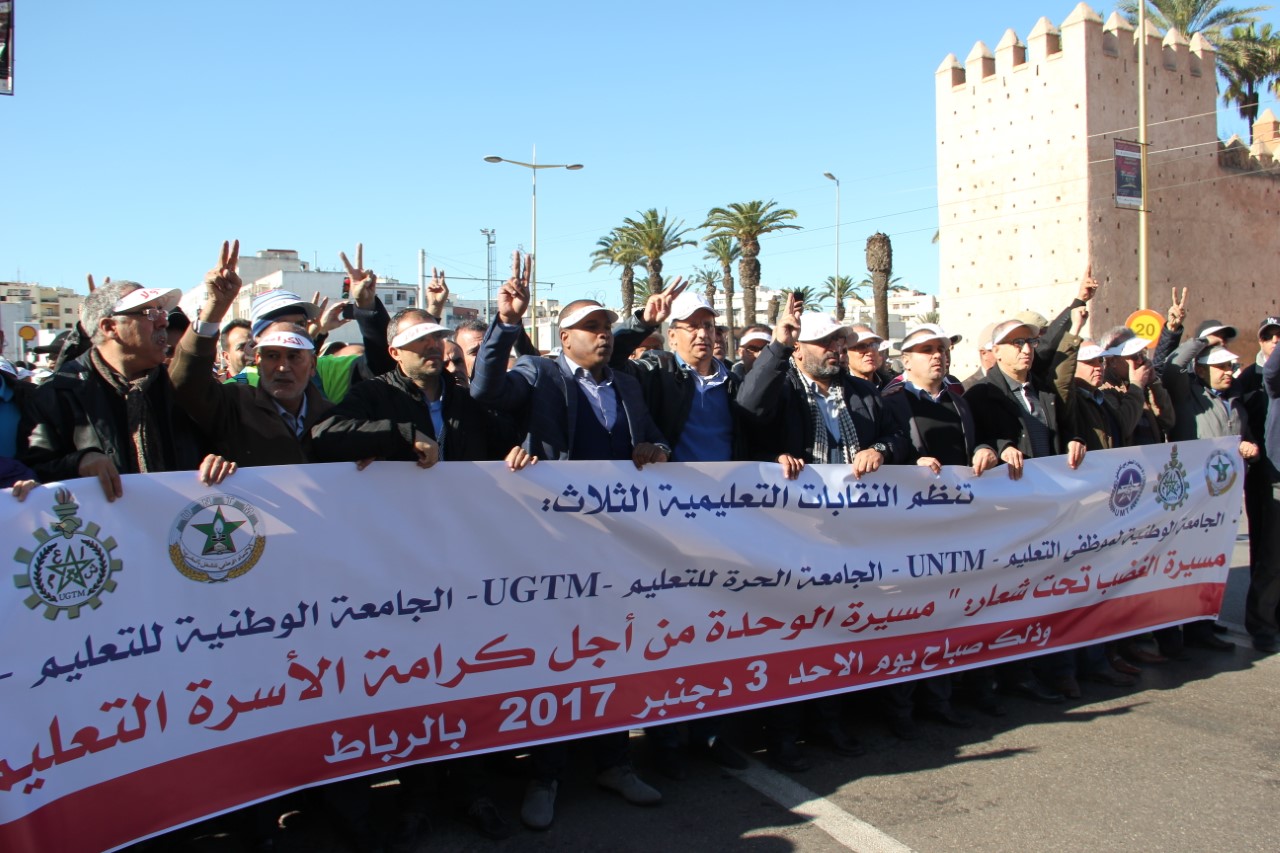 نظمت 3 نقابات تعليمية، مسيرة احتجاجية، صباح يوم الأحد 3 دجنبر ، تحت شعار “مسيرة الوحدة من أجل كرامة الأسرة التعليمية”، حيث انطلقت من ساحة باب الأحد بالرباط في اتجاه مقر وزارة التربية الوطنية.