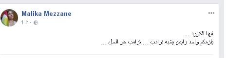 و قالت مزان، في تدوينة فايسبوكية " الحمد لله على نعمة ترامب.. هو ترامب ده كان فين من زمان؟ الملعون تأخر كثير"، وأضافت في تدوينة أخرى "أيها الكورد .. يلزمكم واحد رايس يشبه ترامب ... ترامب هو الحل ...".
