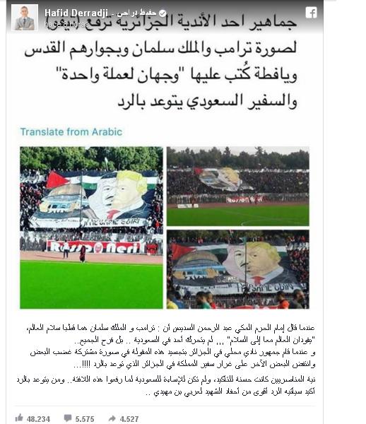 فقد رفع مشجعون لفريق "عين مليلة"، خلال مباراته مع "معسكر غالي"، في دوري الدرجة الثانية لكرة القدم، لافتة كبيرة تجمع العاهل السعودي، الملك سلمان بن عبد العزيز والرئيس الأمريكي، دونالد ترامب.