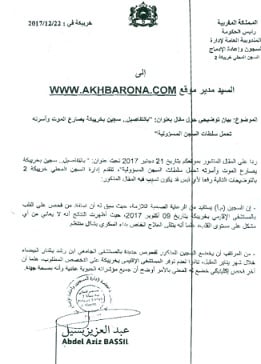 ردا على المقال المنشور بموقعكم بتاريخ 21 دجنبر 2017 تحت عنوان: " بالتفاصيل.. سجين بخريبكة يصارع الموت وأسرته تحمل سلطات السجن المسؤولية"، تتقدم إدارة السجن المحلي خريبكة 2 بالتوضيحات التالية رفعا لأي لبس قد يكون تسبب فيه المقال المذكور: