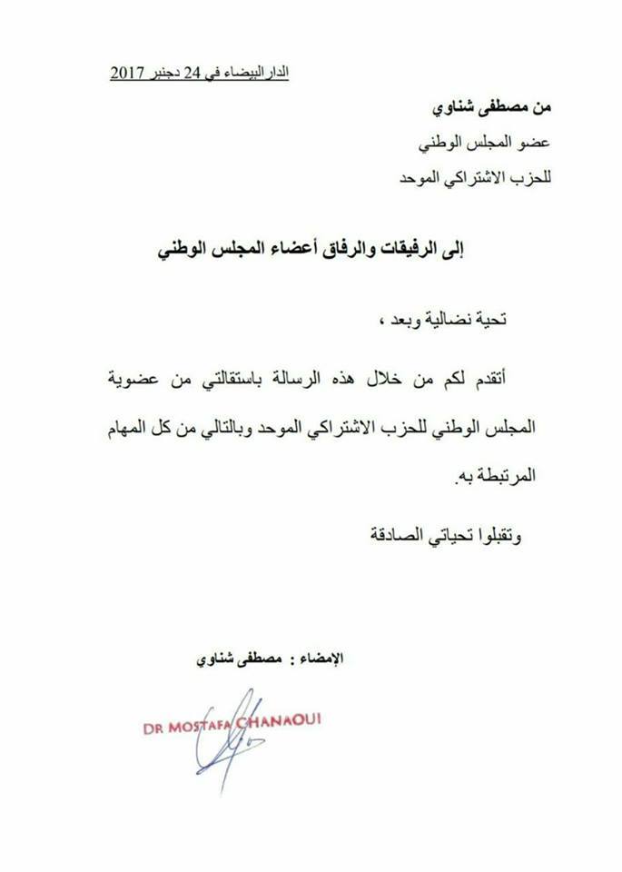 أفادت مصادر خاصة لـ"أخبارنا" ، أن النائب البرلماني مصطفى شناوي عن حزب اليسار الاشتراكي الموحد قدم استقالته من المجلس الوطني للحزب ومن كل المهام المرتبطة به.