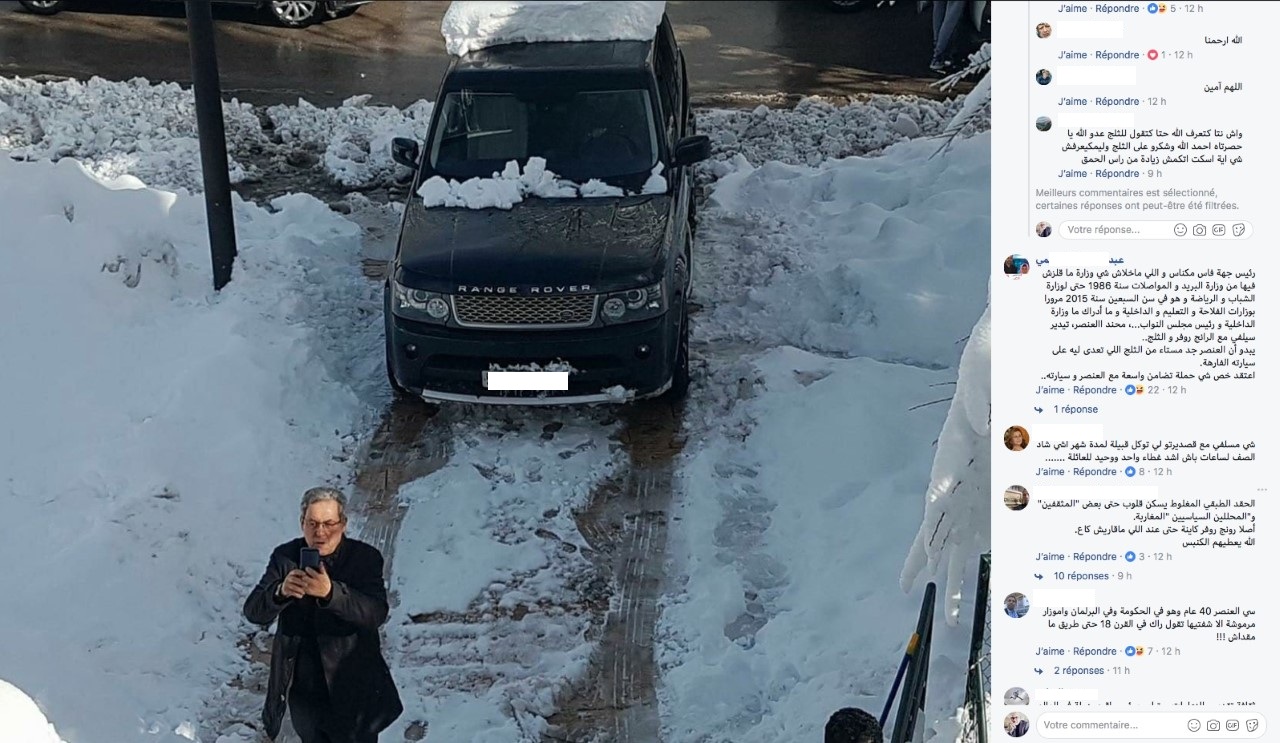 و قال المعلقون، العنصر " طالع ليه الدم " لأن الثلوج غطت سيارته، لأجل ذلك قام بالتقاط هذه الصورة، التي أثارت جدلا كبيرا بين رواد الفيسبوك، و منهم من ربط الصورة بالتغير الذي طرأ على العنصر الذي ولج عالم السياسة حينما كان موظفا بسيطا في البريد، قبل أن يصبح واحدا من أثرياء هذا الوطن، دون أن يقدم أي شيء لمسقط رأسه الذي منحه ثقته حتى يبلغ هذه المكانة، حيث قال أحدهم : " سي العنصر 40 عام وهو في الحكومة و البرلمان و إموزار مرشوشة إلا شفتيها تقول راك في القرن 18 حتى الطريق ما مقداش ".