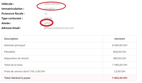 فقد تم التوصل بعد بحث بسيط في الموقع الالكتروني المخصص لأداء الضريبة السنوية على السيارات أن تلك السيارة الفخمة لم يتم أداء ضريبتها منذ سنة 2016، حيث تراكمت عليها غرامات التأخير ليصل مجموع الواجب أداؤه برسم سنة 2016 ما يقارب 7600 درهم ومثلها عن سنة 2017 الماضية وطبعا دون الحديث عن 2018 التي يتم استخلاصها حاليا.
