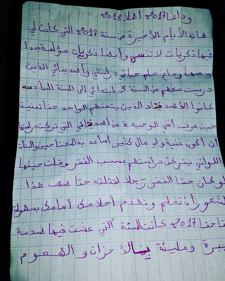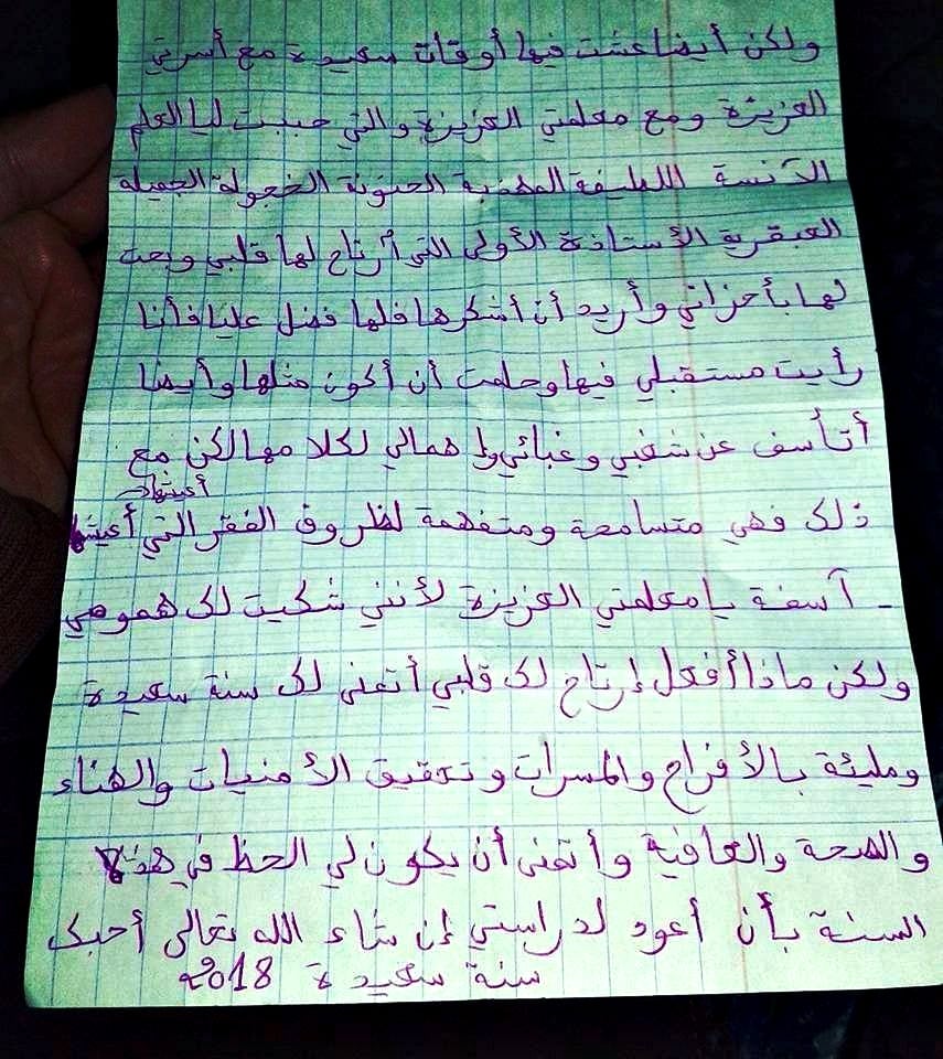 رغم أن التعليم حق دستوري، يكفله القانون، غير أن الألاف من أبناء هذا الوطن ، ليس بوسعهم متابعة دراستهم لأسباب مرتبطة أساسا بالوضع الاجتماعي المزري الذي تتخبط فيه غالبية الأسر المغربية، و النموذج اليوم، رسالة مؤثرة جدا، بعثت بها تلميذة من مدينة الشاون، تدرس في السنة السادسة إبتدائي، إلى معلمتها، تخبرها بانقطاعها عن الدراسة للأسباب المذكورة سالفا، وهي الرسالة التي قامت الأستاذة بنشرها عبر حسابها الفيسبوك، حيث كتبت : " تلقيت هاته الرسالة صباحا من احدى تلميذاتي ،،صراحة جد مؤثرة، العين بصيرة واليد قصيرة ، رسالة تستنجد فيها ( التلميذة ) من واقعها المرير، ما عساي ان افعل لك حقا لو كان الفقر رجلا لقتلته ".