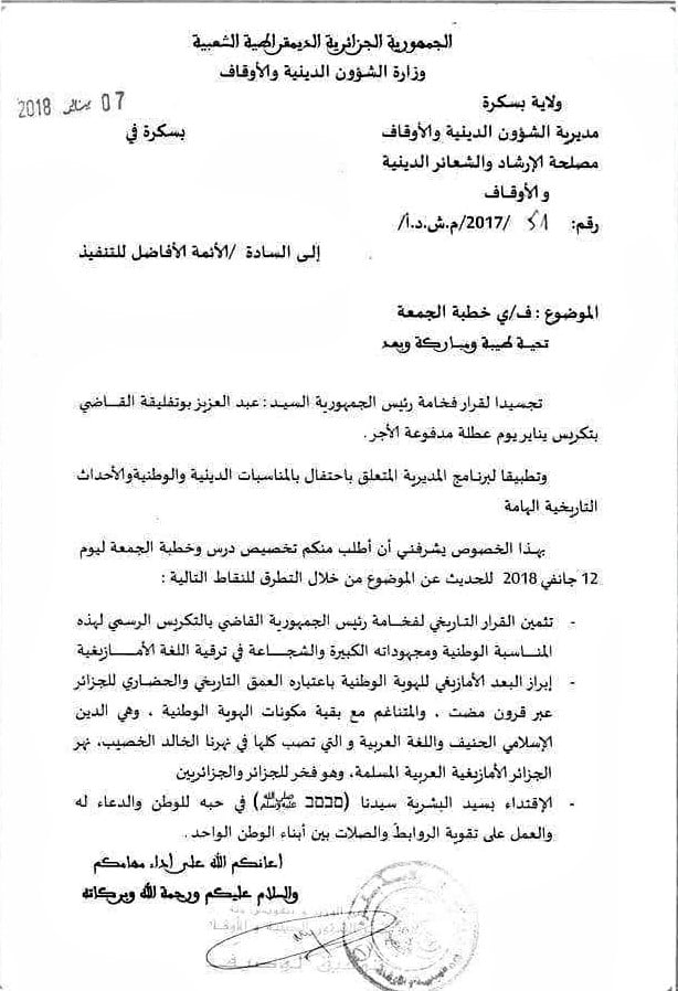وجهت مديرية الشؤون الدينية والأوقاف بالجزائر، تعليماتها إلى السادة الأئمة، قصد تخصيص خطبة الجمعة 12 يناير 2018 المقبل، للحديث عن قرار رئيس البلاد القاضي بترسيم رأس السنة الأمازيغية عيدا وطنيا وعطلة رسمية مدفوعة الأجر .