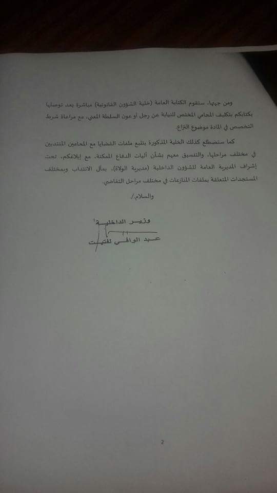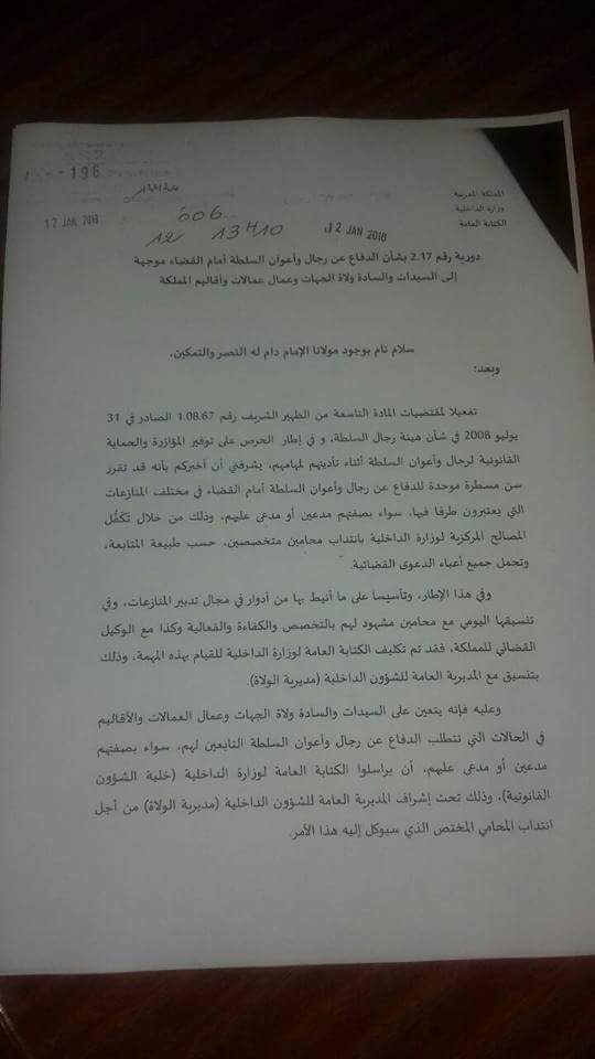 عممت وزارة الداخلية مذكرة مستعجلة تبلغ فيها الولاة والعمال بأنه تقرر سن مذكرة موحدة للدفاع عن رجال السلطة وأعوان السلطة أمام القضاء في مختلف المنازعات التي هم طرف فيها سواء بصفتهم مدعين أو مدعى عليهم،وذلك بانتداب المصالح المركزية لوزارة الداخلية لمحامين متخصصين حسب طبيعة المتابعة، وتحملها لأعباء الدعاوى القضائية.