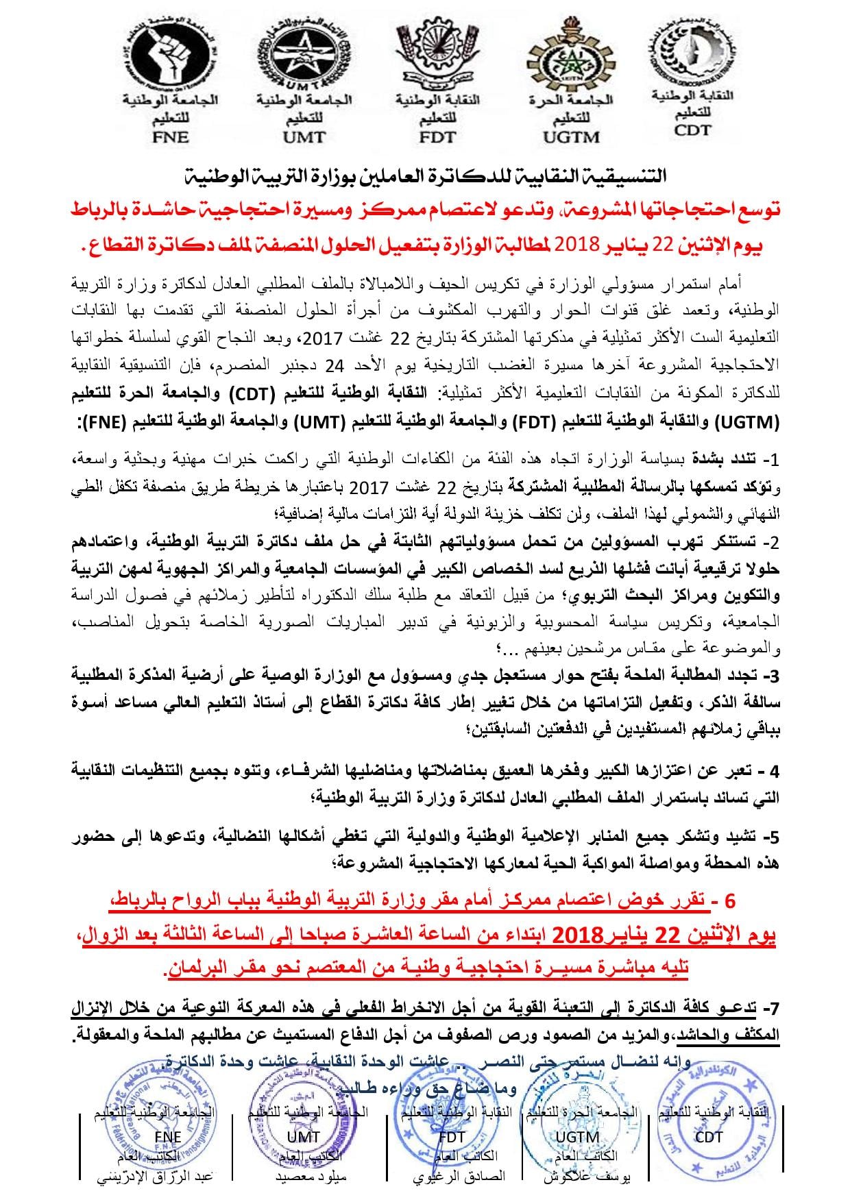 6 - تقرر خوض اعتصام ممركـز أمام مقر وزارة التربية الوطنية بباب الرواح بالرباط، يوم الإثنين 22 ينايـر2018ابتداء من الساعة العاشـرة صباحا إلى الساعة الثالثة بعد الزوال، تليه مباشـرة مسيــرة احتجاجيـة وطنيـة من المعتصم نحو مقـر البرلمان.