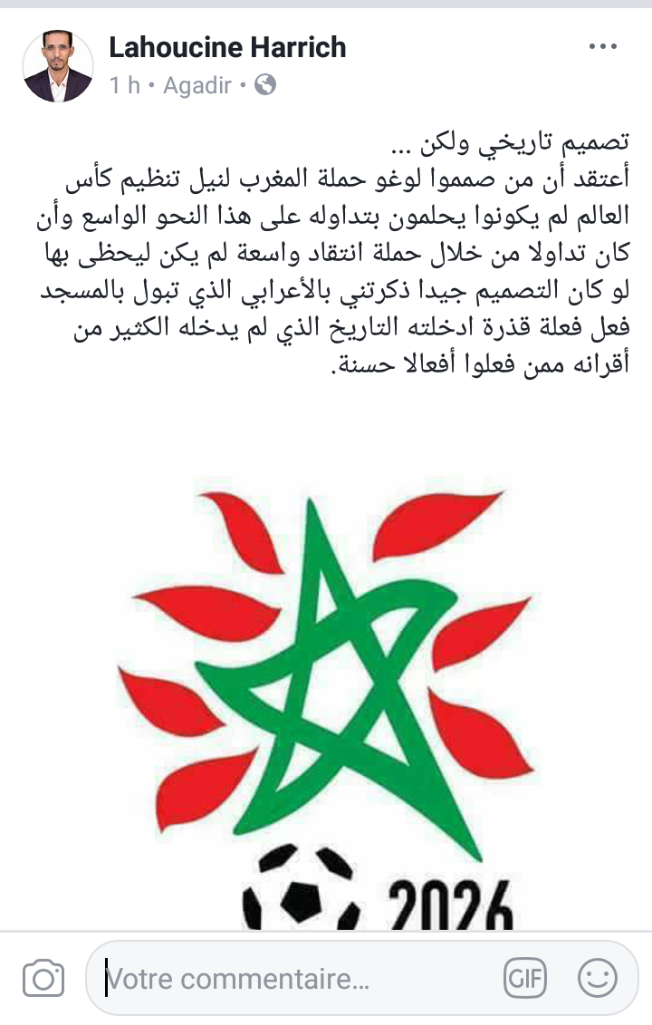 بعد الضجة الكبيرة التي خلقها تصميم ترشيح المغرب لإحتضان كأس العالم 2026 بالشارع المغربي وبين رواد مواقع التواصل الإجتماعي، دخل القيادي البارز ضمن حزب العدالة والتنمية والنائب البرلماني عن دائرة أيت ملول "الحسين حريش"على خط هذا الجدل الواسع وذلك من خلال تدوينة مثيرة له على حسابه الفيسبوكي حيث إعتبره تصميما تاريخيا.