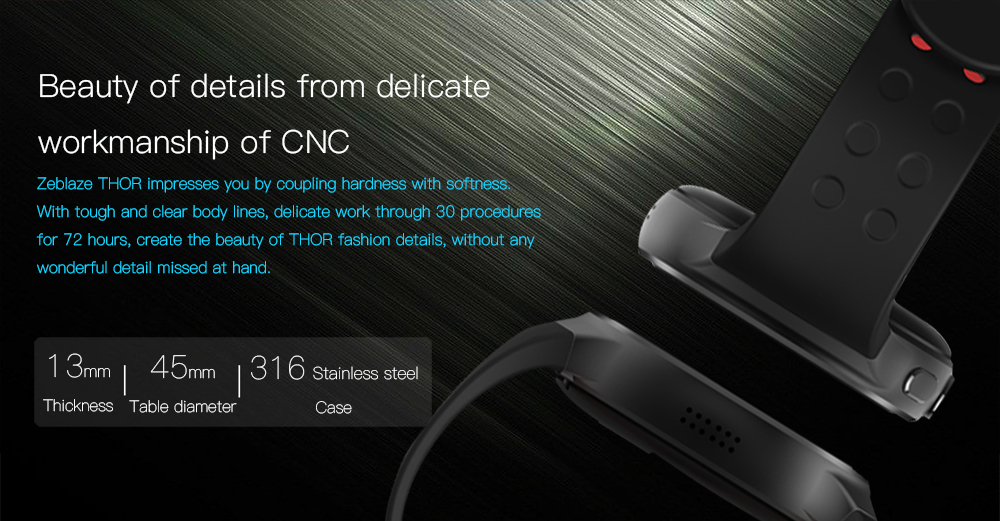وتمتاز ساعة "Zeblaze THOR"  بتصميم أنيق و شاشة لمسية بدقة عالية تقدم رؤية واضحة تحت ضوء الشمس لكل ما يظهر على الشاشة ، كما تدعم أيضا العديد من تقنيات الأتصال مثل WiFi ، بلوتوث 4.0 و  تحديد المواقع GPS .