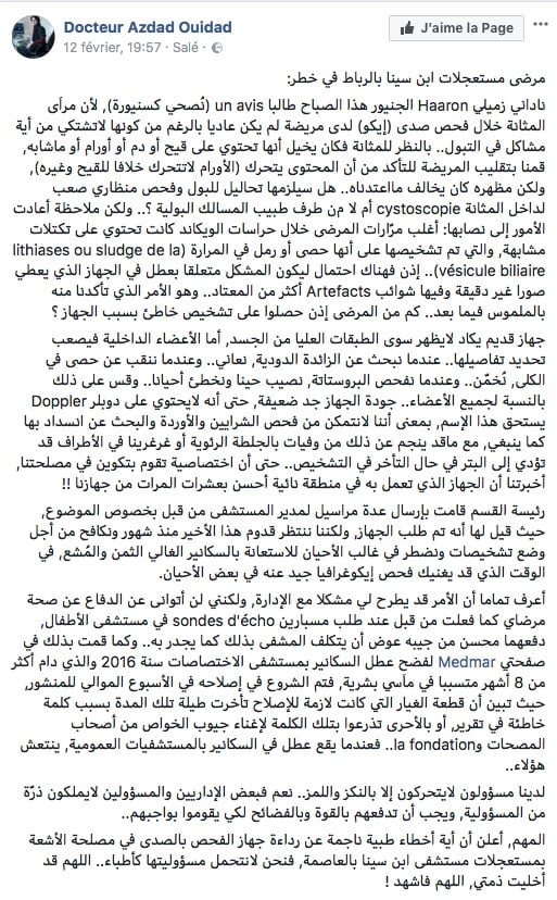 وفي سياق متصل، اكدت الدكتورة وداد أن : " رئيسة القسم قامت بإرسال عدة مراسيل لمدير المستشفى من قبل بخصوص الموضوع, حيث قيل لها أنه تم طلب الجهاز, ولكننا ننتظر قدوم هذا الأخير منذ شهور ونكافح من أجل وضع تشخيصات ونضطر في غالب الأحيان للاستعانة بالسكانير الغالي الثمن والمُشع, في الوقت الذي قد يغنيك فحص الإيكوغرافيا جيد عنه في بعض الأحيان "، مشددة أنها : " تعرف تماما أن الأمر قد يطرح لي مشاكل مع الإدارة, ولكنني لن أتوانى عن الدفاع عن صحة مرضاي كما فعلت من قبل عند طلب مسبارين sondes d'écho في مستشفى الأطفال, دفعهما محسن من جيبه عوض أن يتكلف المشفى بذلك كما يجدر به.. وكما قمت بذلك في صفحتي " MADMAR "، لفضح عطل السكانير بمستشفى الاختصاصات سنة 2016 والذي دام أكثر من 8 أشهر متسببا في ماَسي بشرية, فتم الشروع في إصلاحه في الأسبوع الموالي للمنشور, حيث تبين أن قطعة الغيار التي كانت لازمة للإصلاح تأخرت طيلة تلك المدة بسبب كلمة خاطئة في تقرير, أو بالأحرى تبرعوا بتلك الكلمة لإغناء جيوب الخواص من أصحاب المصحات وla fondation.. فعندما يقع عطل في السكانير بالمستشفيات العمومية, ينتعش هؤلاء..".