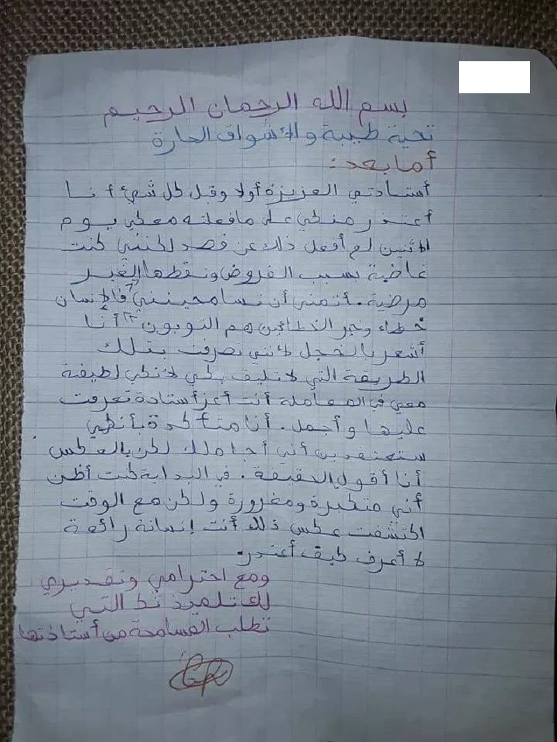 واعتذرت التلميذة من معلمتها قائلة :" تحية طيبة والأشواق الحارة.. أما بعد أستاذتي العزيزة أولا وقبل كل شيء أنا أعتذر منكي على ما فعلته معكي يوم الإثنين لم أفعل ذلك عن قصد لكني كنت غاضبة بسبب الفروض ونقطتها الغير مرضية".