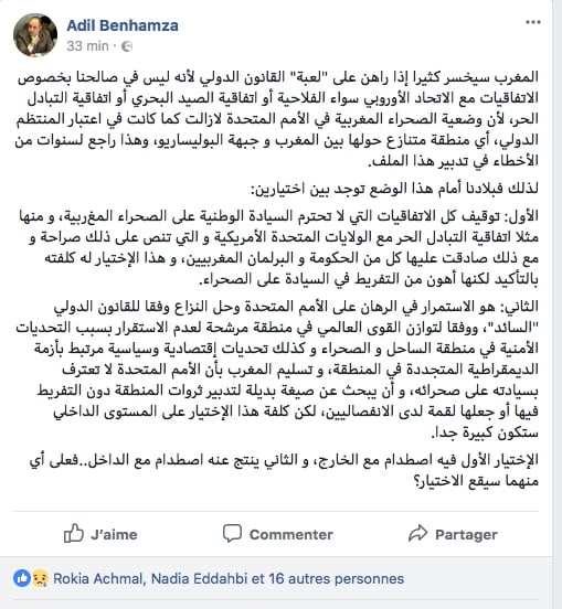 في تدوينة له عبر حسابه الخاص على الفيسبوك، قال القيادي الإستقلالي و الناطق باسمه سابقا أن : " المغرب سيخسر كثيرا إذا راهن على "لعبة" القانون الدولي لأنه ليس في صالحنا بخصوص الاتفاقيات مع الاتحاد الأوروبي سواء الفلاحية أو اتفاقية الصيد البحري أو اتفاقية التبادل الحر، لأن وضعية الصحراء المغربية في الأمم المتحدة لازالت كما كانت في اعتبار المنتظم الدولي، أي منطقة متنازع حولها بين المغرب و جبهة البوليساريو، وهذا راجع لسنوات من الأخطاء في تدبير هذا الملف ".